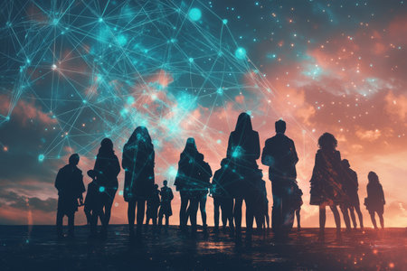 A conceptual depiction of two hands connecting, visualizing the synergy between humanity and technology through virtual network-inspired visuals.