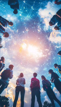 This image portrays multiple hands extending towards a central source of radiant light, set against a backdrop suggesting the cosmos. The composition features visual elements such as glowing particles and a diffused light effect. Suitable for representing themes of unity, energy, or spiritual connection, it may serve diverse commercial applications.