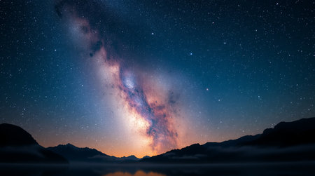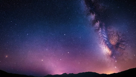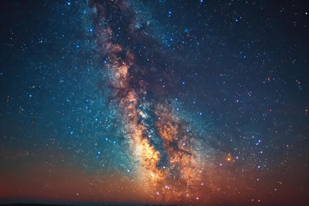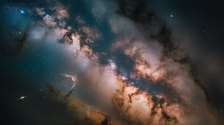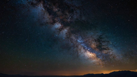 A breathtaking view of the Milky Way galaxy showcases vibrant colors and intricate patterns of stars and cosmic dust against a dark night sky, revealing the beauty of the universe