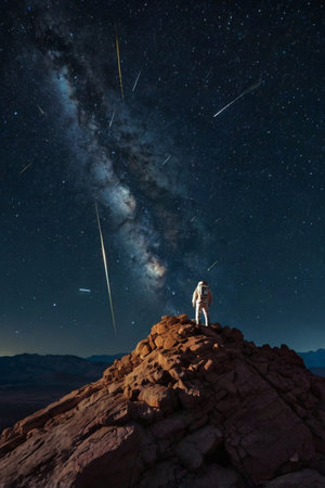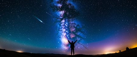 Concept photo of a person gazing up at a starry night sky, with the Milky Way galaxy stretching above them. The vastness of the universe and the persons small presence signify the grandeu