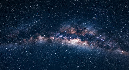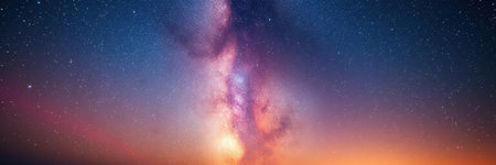 A panoramic view of the Milky Way galaxy, showcasing vibrant colors, sparkling stars, and swirling cosmic dust.