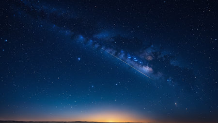 A breathtaking view of a starry night sky filled with twinkling stars and shimmering cosmic dust against a rich dark blue background, evoking calmness.