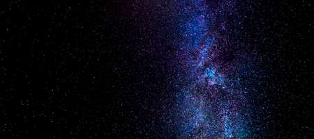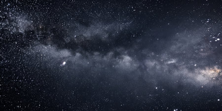 Panorama view of universe space shot of nebula and milky way galaxy with stars on blue night sky. Beautiful scene of Milky Way that contains our Solar System under amazing starry night sky with noise