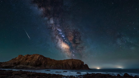Shooting star with a bright trail passing through the Milky Way, with distant galaxies and colorful stardust generative ai