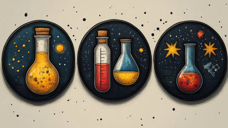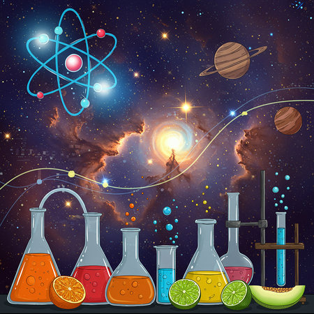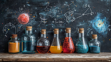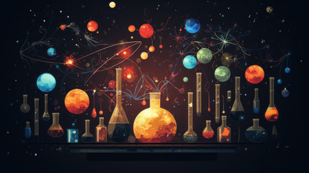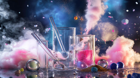 Chemistry-inspired scene with lab glass and powdered elements on vivid background