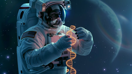 Astronaut in a spacesuit examines a glowing DNA strand in space, symbolizing biotech progress