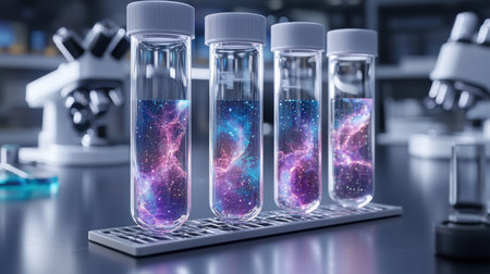 Four glass vials filled with colorful liquid, one of which is labeled DNA. The vials are arranged on a table in front of a microscope. Concept of scientific exploration and discovery