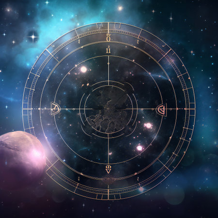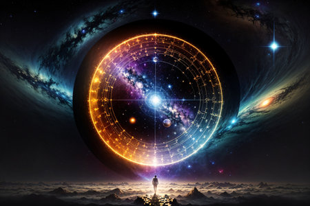 Celestial zodiac wheel surrounded by stars and constellations in a deep space setting, showcasing astrological symbols and elements