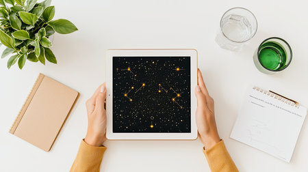 A womans hands holding a tablet with a blank screen on a white table, Surround her with a notepad, plant, and glass of water, The setting is warm with vivid emerald accents, illuminated by a bright midday sun that adds depth and focus to the position.