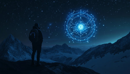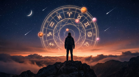 A silhouette of a person on a mountain top gazes at a glowing astrological chart with zodiac signs and planets in the mystical night sky above the clouds.