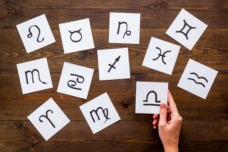 Astrological horoscope with female hand choosing Zodiac signs