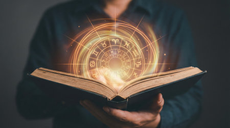 A person holds an open book from which a luminous astrological chart with zodiac signs emerges. This represents fortune telling, horoscopes, and mystical knowledge.