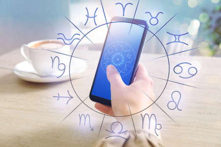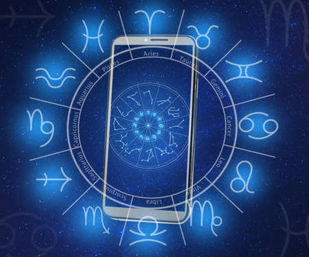Multiple exposure of modern smartphone, night sky and zodiac wheel. Horoscope online