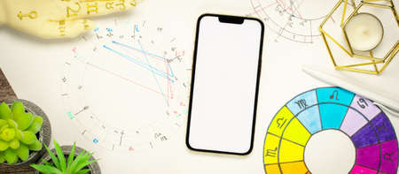 Cartomancy and fortune telling concept. Natal chart smartphone with White screen tarot cards. high quality photo