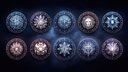 Backdrop of sacred zodiac symbols, astrology, alchemy, magic, sorcery and fortune telling. AI-generated digital painting.