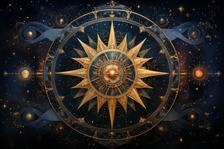 This captivating image features an intricate astrological wheel adorned with golden zodiac signs and celestial symbols set against a dark background.