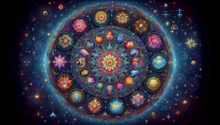Celestial zodiac wheel surrounded by stars and constellations in a deep space setting, showcasing astrological symbols and elements