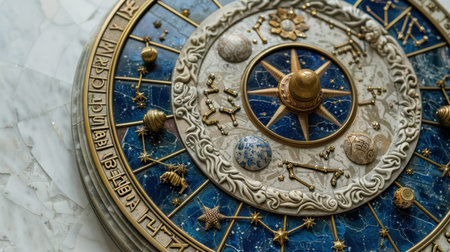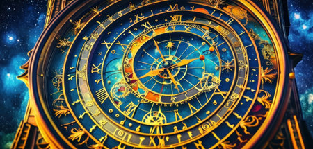 Close-up of an ornate astronomical clock with zodiac signs in rich blue and gold colors