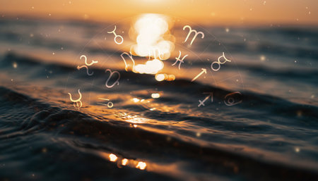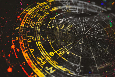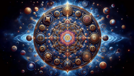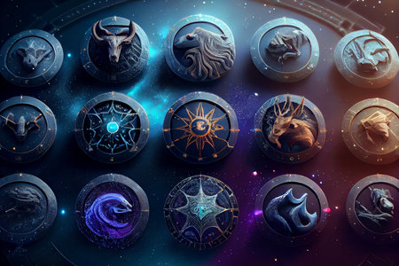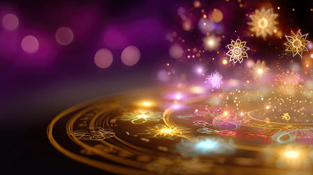 Backdrop of sacred zodiac symbols, astrology, alchemy, magic, sorcery and fortune telling. AI-generated digital painting.