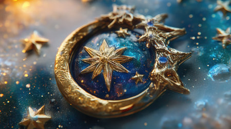 This stunning image showcases a beautifully designed gold crescent moon and star ornament, set against a vibrant cosmic backdrop filled with shimmering stars and galaxies.