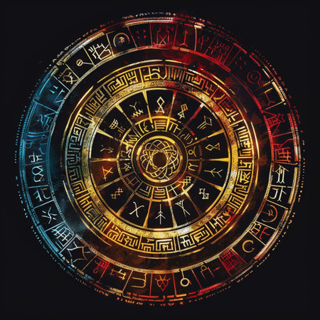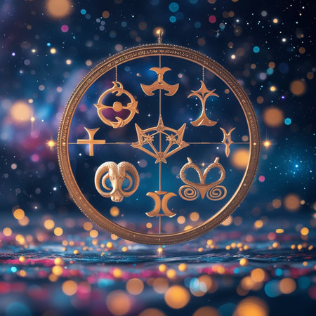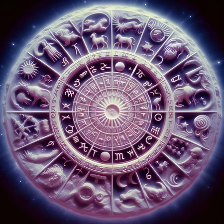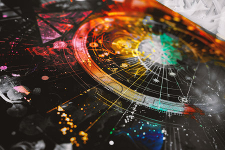 This vibrant representation of zodiac signs and celestial symbols captures the mystical essence of astrology, blending colors and light to create a cosmic atmosphere.