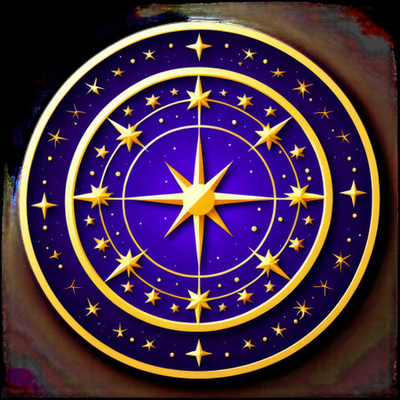 Golden astrological chart on a dark blue background, with constellations and celestial symbols, perfect for astrology enthusiasts and spiritual designs