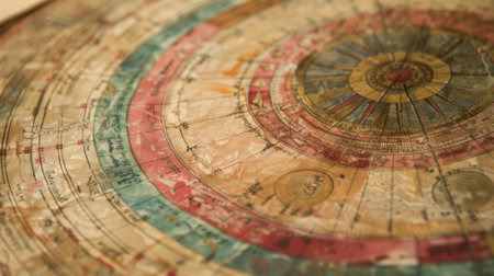 A close-up view of hands adorned with rings tracing an intricate astrological chart on a vintage map, surrounded by mysterious accessories, evoking a sense of wonder and exploration.