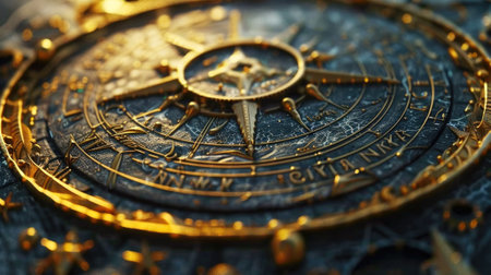An intricate, golden zodiac chart or astrological wheel glows with sparkling stardust and wisps of smoke against a dark cosmic background. This mystical image is perfect for fortune-telling and esoteric themes.