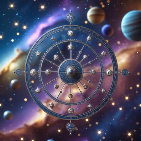 A detailed view of an astrological chart with celestial bodies and a night sky backdrop highlighting cosmic connections
