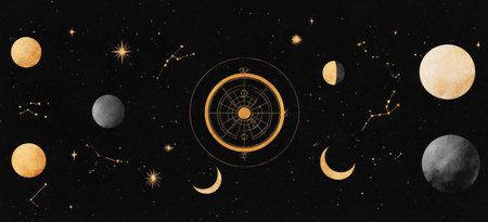 Astrological celestial illustration featuring planets, constellations, and zodiac signs on a dark starry background, perfect for astrology enthusiasts and cosmic themes