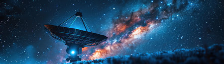 Large satellite dish pointing at starry sky, Milky Way visible, deep space exploration, night shot