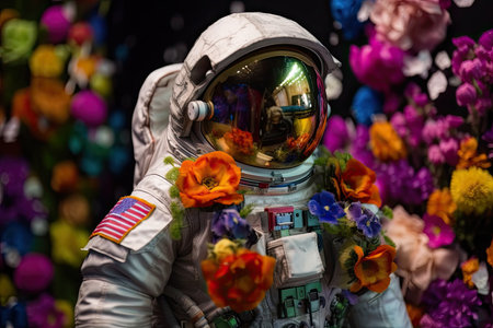 close-up of astronauts spacesuit with colorful flowers in the background, created with generative ai