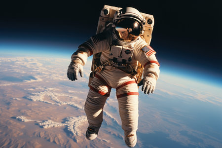 Cosmonaut in a spacesuit flying in outer space near the orbit of the planet Earth, space expedition, generative AI.