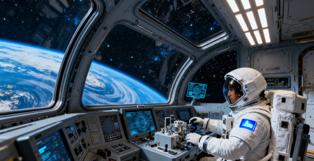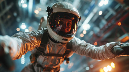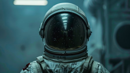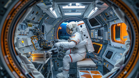 Astronaut in Space Station, Draw a life-like portrait of an astronaut wearing a suit, floating weightlessly inside a space capsule, AI Generated