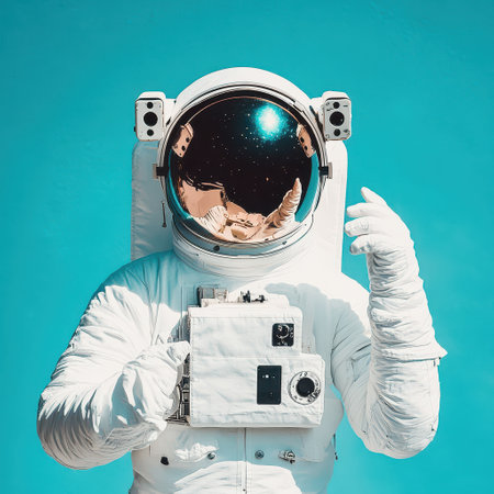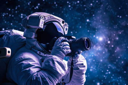 American astronaut in space suit floating in space, taking photographs with a digital camera