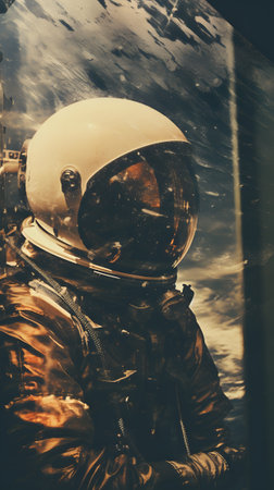 astronaut, gazing out of the window of spaceship, with view of the earth visible below, created with generative ai