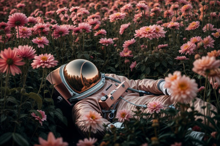 An astronaut in a reflective helmet relaxes amidst a vibrant field of pink flowers, blending space exploration with nature's tranquility.