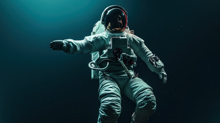 A person in an astronaut suit floating with outstretched arms against a black background in a dark atmosphere, with a minimalist style, award winning photography