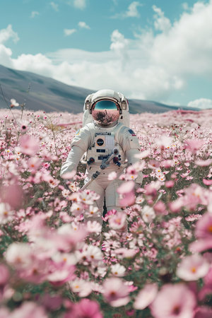 Astronaut in space suit among vibrant flowers in summer meadow. Surreal portrait of a space traveler