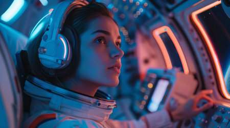 A woman in a space suit is wearing headphones and looking out the window of a spaceship. The scene is set in a brightly lit room with neon colors