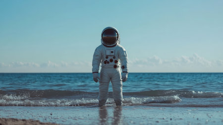 Astronaut enjoying a peaceful moment on the beach with the sea in the background, capturing a unique blend of space and relaxation.