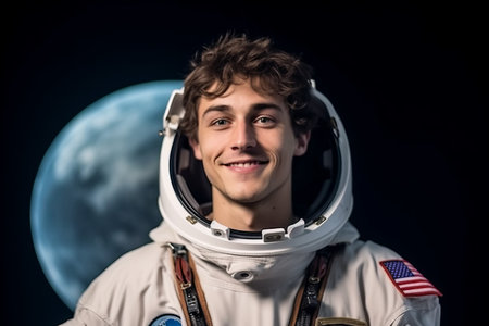 Portrait of smiling astronaut in spacesuit against moon on black background