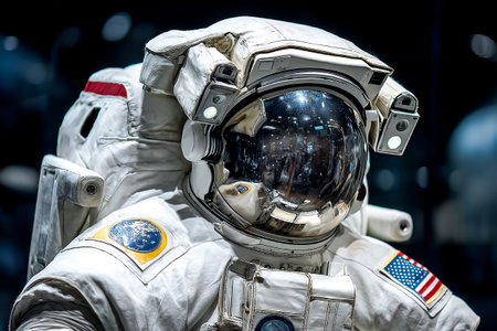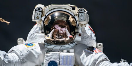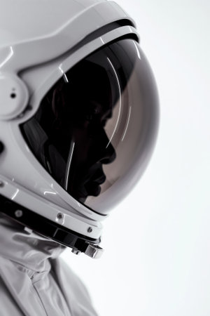 Detailed view of a male astronaut's helmet visor against a white background, focusing on space exploration gear