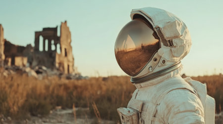 Astronaut observes a ruined building in a barren landscape. Possibly on another planet or a post apocalyptic earth. Raising questions about the future of civilization and the impact of exploration