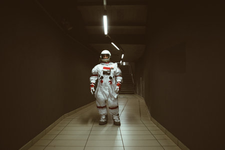 spaceman in a futuristic station. Man with space suit walking in an urban area