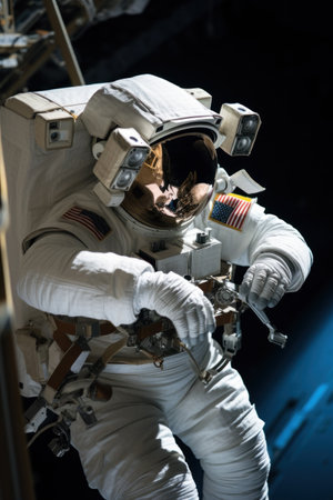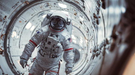 Astronaut in white spacesuit with american flag patch floating inside illuminated spacecraft module during space mission exploration.