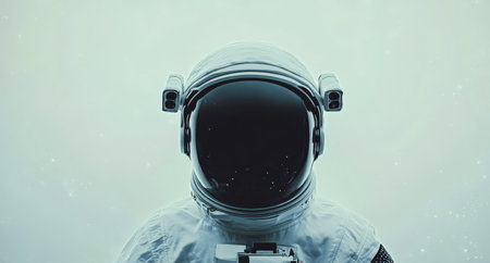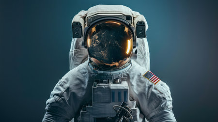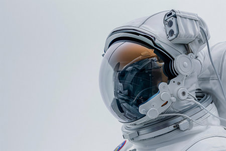 Close-up of a contemporary astronaut in a stylish space suit with a reflective helmet visor