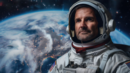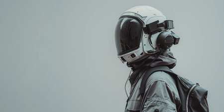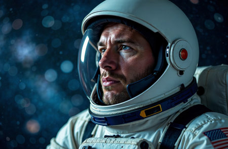 A man in a space suit is looking at the camera. The image has a futuristic and adventurous mood