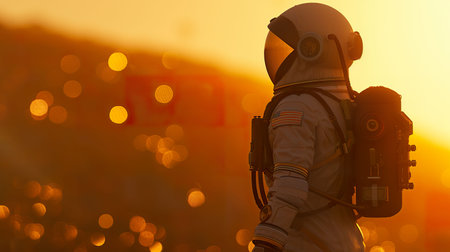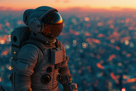 A solitary astronaut stands against a backdrop of city lights glowing at dusk, a metaphor for exploration and solitude.