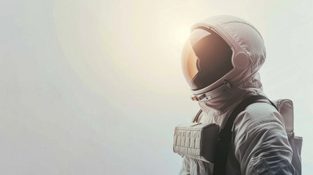 A futuristic astronaut stands in a striking white suit, gazing into the distance. The bright light creates a sense of adventure and exploration, embodying the spirit of discovery in the cosmos.
